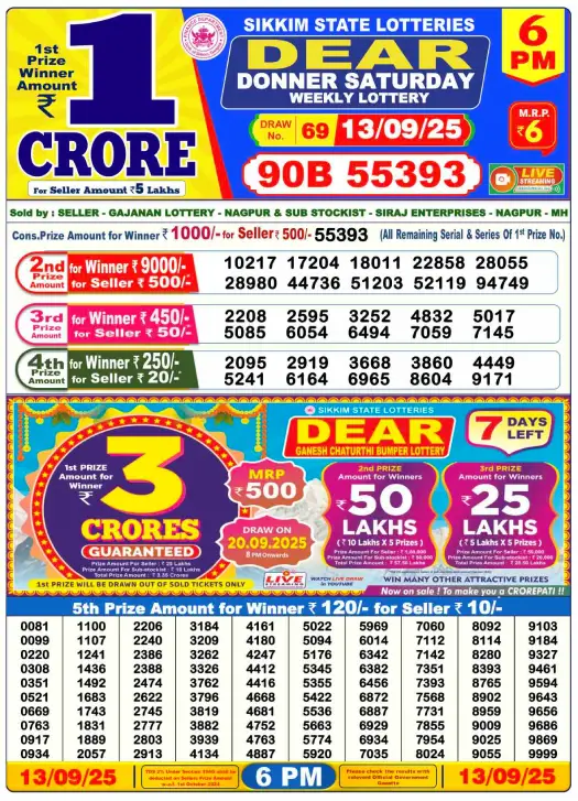 Lottery Sambad Day 6:00 PM 13.9.2025. You can find the Lottery Sambad Day result 13/9/2025. Nagaland State Lotteries 13.9.2025 Lottery Sambad Today Day Result at 6 PM. Dear Day result from 6:00 PM. Dear Dau Results.