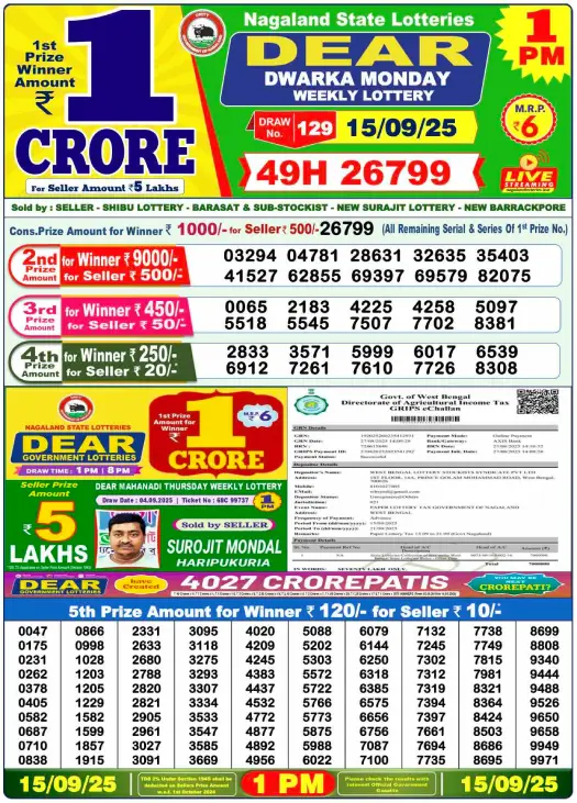 Nagaland Lottery Sambad 15 September 2025 Result. Dear Lottery Today Results. Nagaland Lottery Sambad 1:00 PM Result. Lottery Sambad 6:00 PM Result. Lottery Sambad 8:00 PM Result.