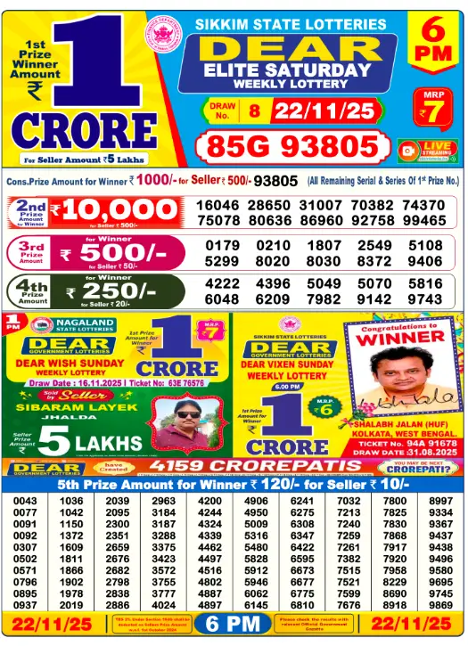 Nagaland Lottery Sambad 22 November 2025 Result. Dear Lottery Today Results. Nagaland Lottery Sambad 1:00 PM Result. Lottery Sambad 6:00 PM Result. Lottery Sambad 8:00 PM Result.