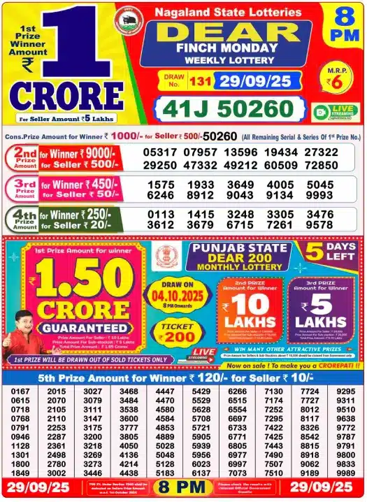 Nagaland Lottery Sambad 29 September 2025 Result. Dear Lottery Today Results. Nagaland Lottery Sambad 1:00 PM Result. Lottery Sambad 6:00 PM Result. Lottery Sambad 8:00 PM Result.