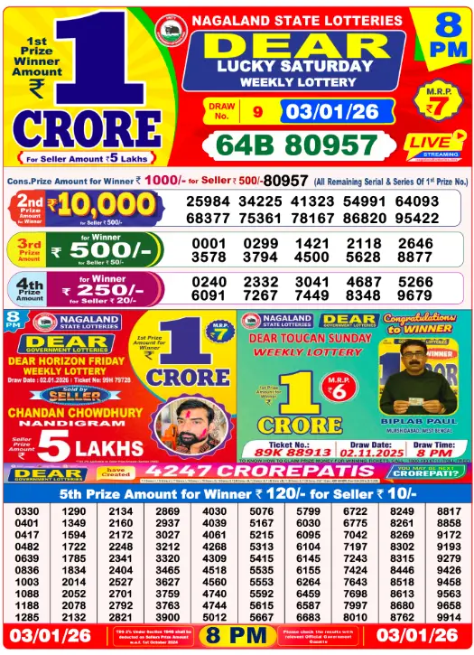Nagaland Lottery Sambad 3 January 2026 Result. Dear Lottery Today Results. Nagaland Lottery Sambad 1:00 PM Result. Lottery Sambad 6:00 PM Result. Lottery Sambad 8:00 PM Result.