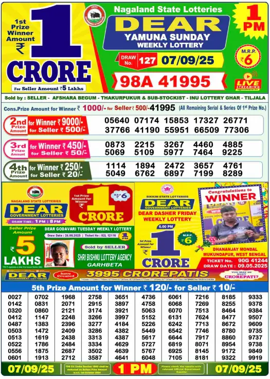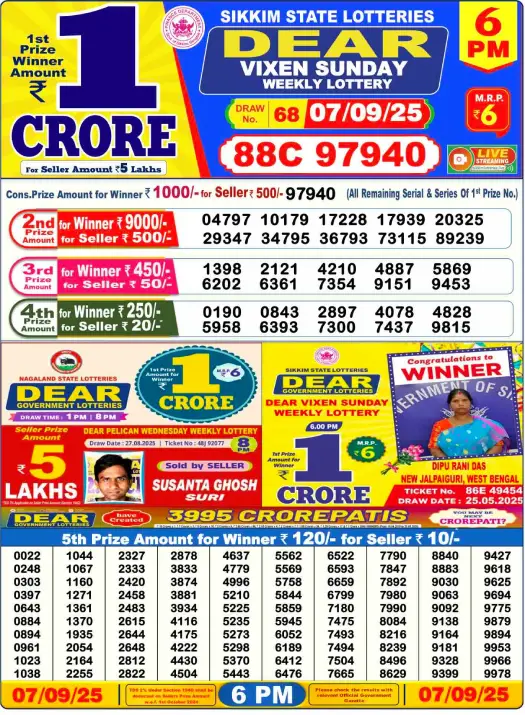 Nagaland Lottery Sambad 7 September 2025 Result. Dear Lottery Today Results. Nagaland Lottery Sambad 1:00 PM Result. Lottery Sambad 6:00 PM Result. Lottery Sambad 8:00 PM Result.